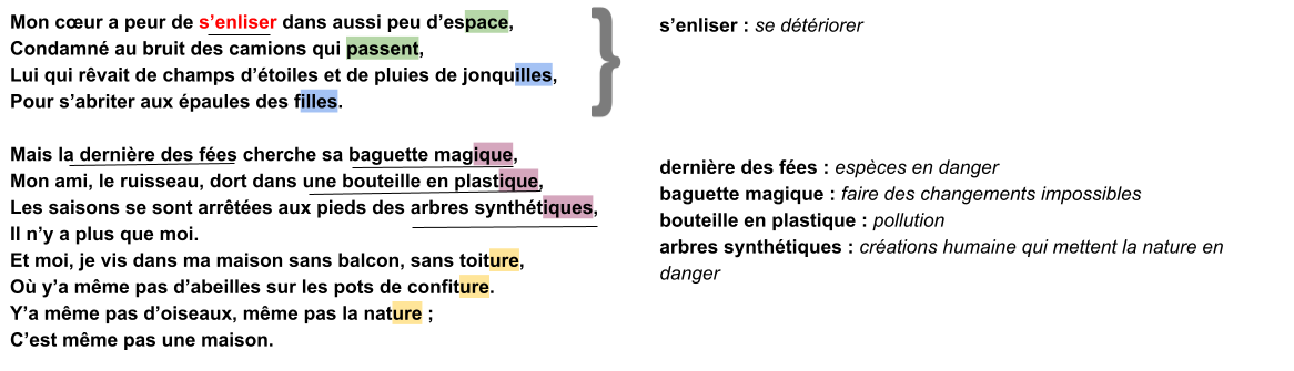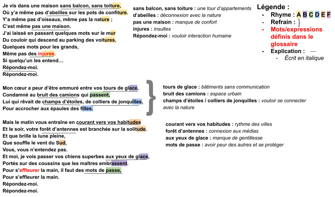Dans la chanson Répondez-moi, Francis Cabrel explore les villes par rapport à la nature et le manque de connexion entre humains. La phrase « Répondez-moi » explique simplement le manque de communication entre les gens. Avec le contexte écologique, on peut conclure que cette phrase peut signifier une dénonciation de la manière dont la société se comporte qui affecte la nature, mais personne ne s'en soucie. Il parlent aussi de l'absence de la nature comme l'enlèvement des « abeilles sur les pots de confiture ». De plus, il décrit son monde idéal (un champ calme rempli d'étoiles), ce qui est presque opposé à ce qu'on a créé. Il explique qu'il ne se sent pas à l'aise et que sa maison n'est « même pas une maison ». En résumé, il explique qu'on perd la nature et le confort qu'elle apporte puisque personne ne l'écoute.