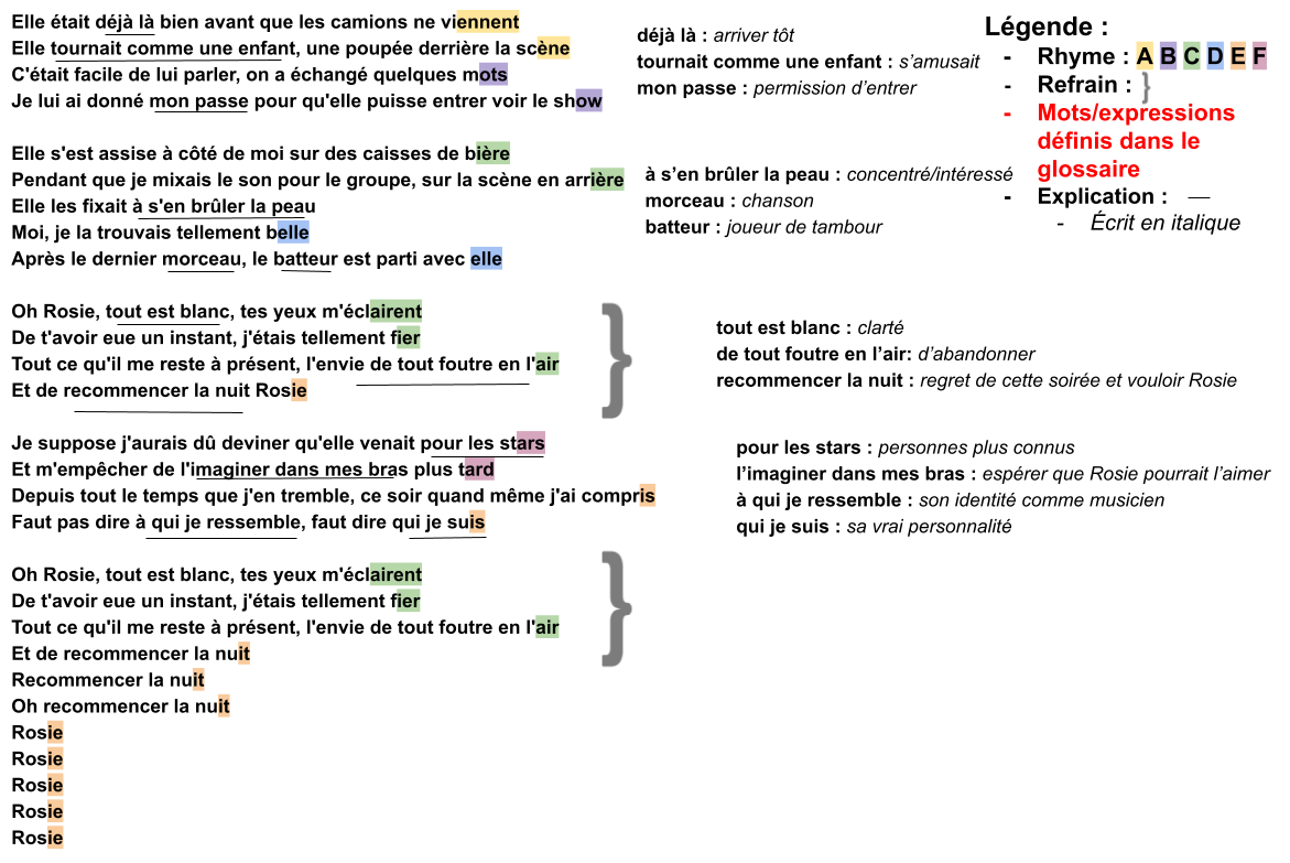 La chanson Rosie parle d'un homme dans un groupe musical qui aime une fille nommée Rosie. Il l'a invitée à un concert où elle rencontre le batteur avec qui elle part. Le narrateur est jaloux du batteur et est triste d'avoir perdu Rosie. Il dit à plusieurs reprises qu'il aimerait « recommencer la nuit » pour avoir une autre chance. Il réalise qu'elle recherchait quelqu'un de célèbre vers la fin de la chanson et réalise qu'il préférerait qu'elle l'aime pour lui et non pour sa popularité.